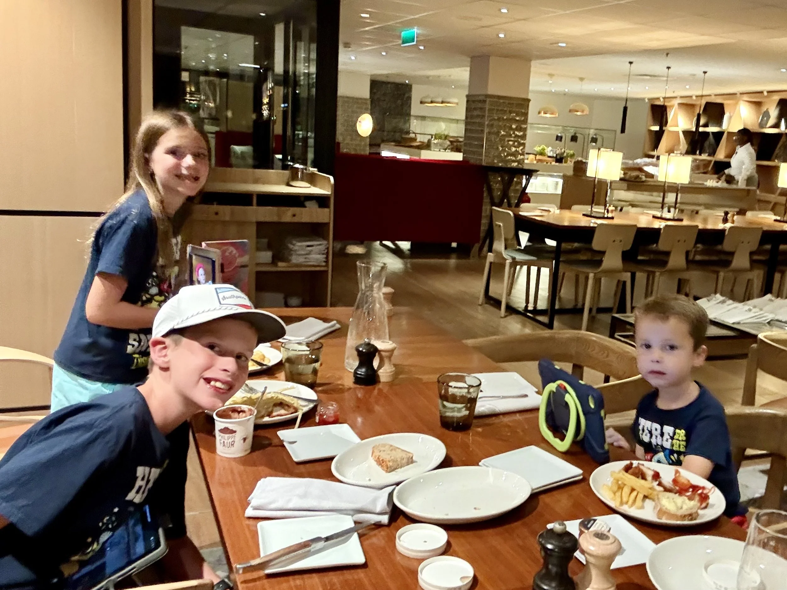 We grabbed dinner at the hotel lobby restaurant for ease and convenience, followed by early showers for everyone and lights out around 9:00 p.m.